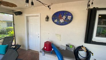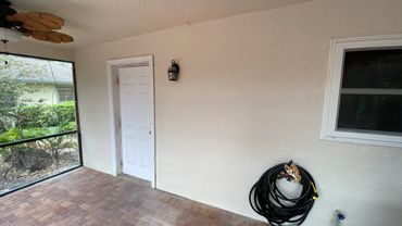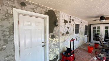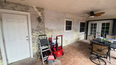 Stucco repair project. Complete clearing of the previous layer, repairs done, completed with primer and paint. Click the image to view the full process it took to properly repair this wall!
